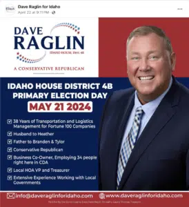 Raglin is a community-oriented individual prioritizing kindness, collaboration, and finding common ground amongst individuals. With a 38-year background in transportation, delivery, management, and logistics, he brings a wealth of experience in driving value-added growth strategies. His mission is to champion the self-reliance and perseverance that define Idaho while addressing pressing issues such as the housing crisis, education, law enforcement, and government accountability. Emphasizing open communication and collaboration with constituents, Raglin seeks to represent the diverse voices of North Idaho and promote solutions that benefit the entire community. He is running for his first term in the Idaho House of Representatives.